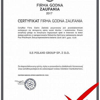 ILS POLAND GROUP w roku 2017 została nagrodzona przez Centrum Badania Opinii Klientów certyfikatem "Firma Godna Zaufania". Certyfikat przyznawany jest przez CBOK przedsiębiorcom cechującym się dobrą opinią wśród klientów i kontrahentów, a także profesjonalnym i rzetelnym podejściem do klienta, na podstawie specjalistycznych, zaawansowanych ...