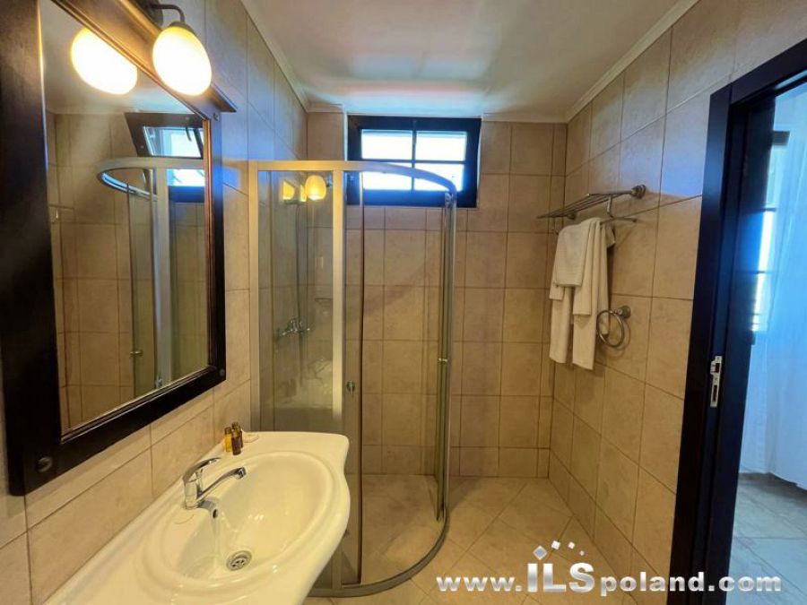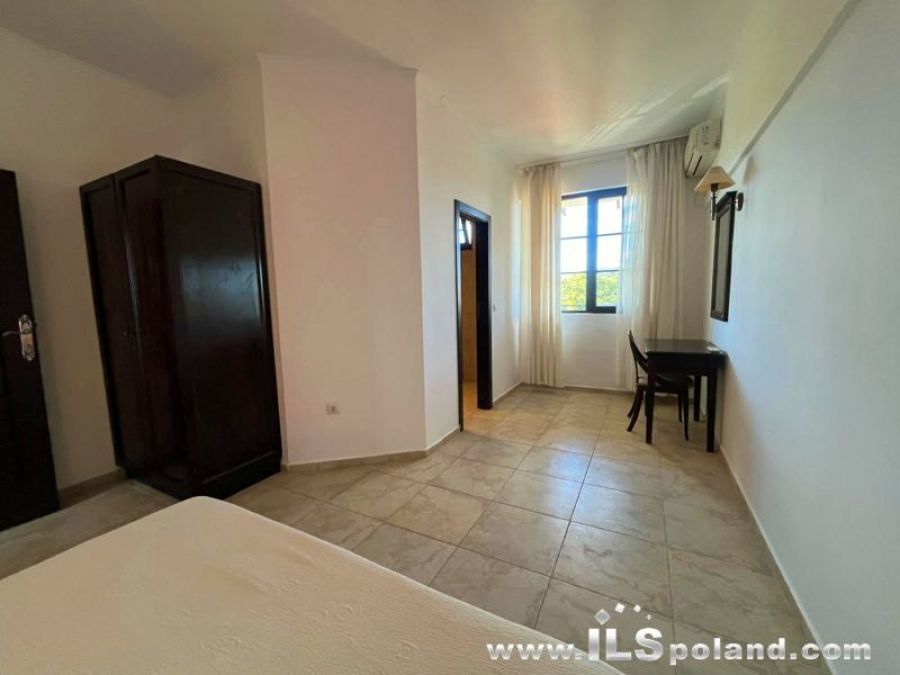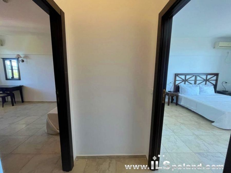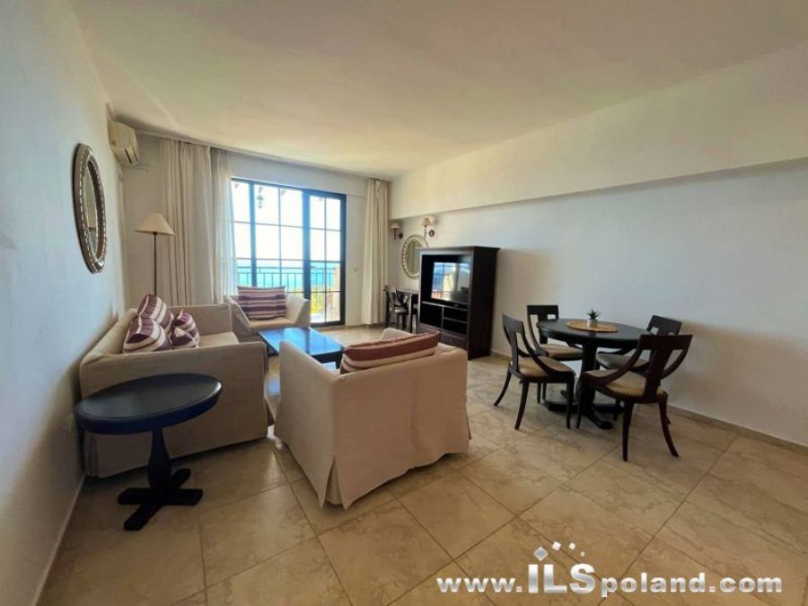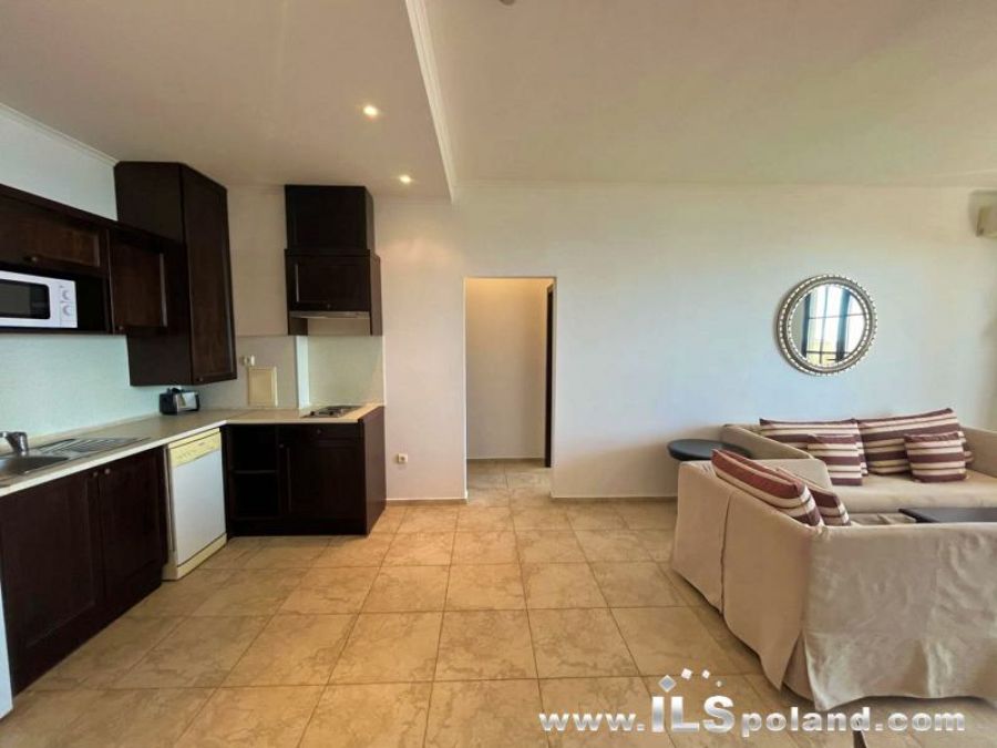 Apartament składa się z dużego salonu z aneksem kuchennym, 2 sypialni, szerokiego przedpokoju, korytarza, 2 łazienek z WC, w tym jedna z wanną, a jedna z kabiną prysznicową oraz tarasu z bezposrednim, otwartym widokiem na morze, basen, ogród i okoliczne lasy oraz wzgórza (widok od strony wschodniej).