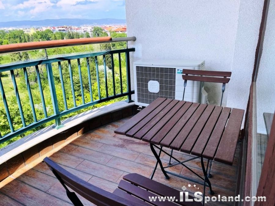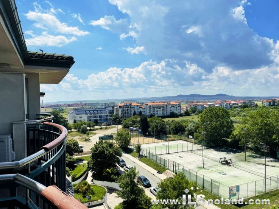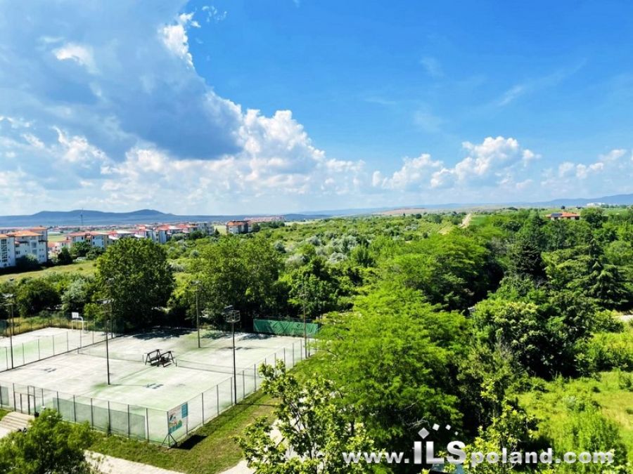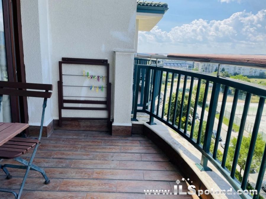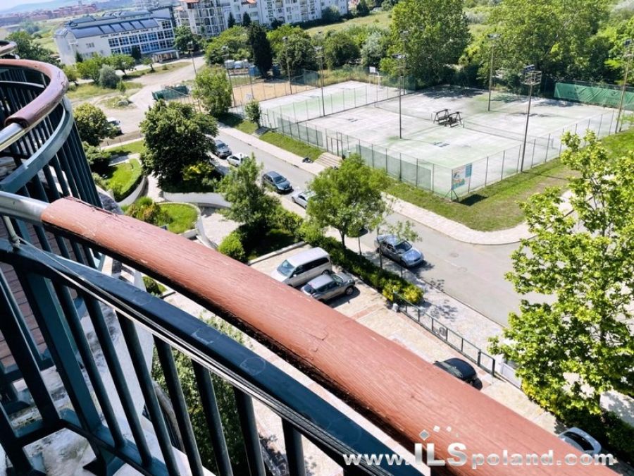 Apartament składa się z salonu z aneksem kuchennym, przedpokoju-korytarza z garderobą, łazienki z WC z wanną oraz dużego balkonu z widokiem na korty tenisowe, ogród i sąsiednie zabudowania, należące do kompleksu (widok od strony północno-zachodniej).