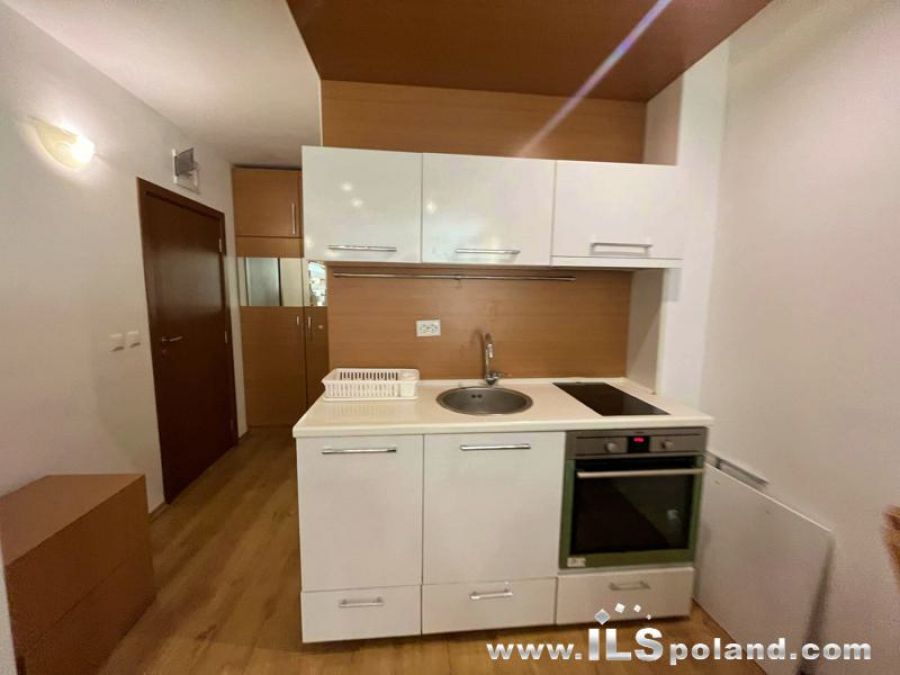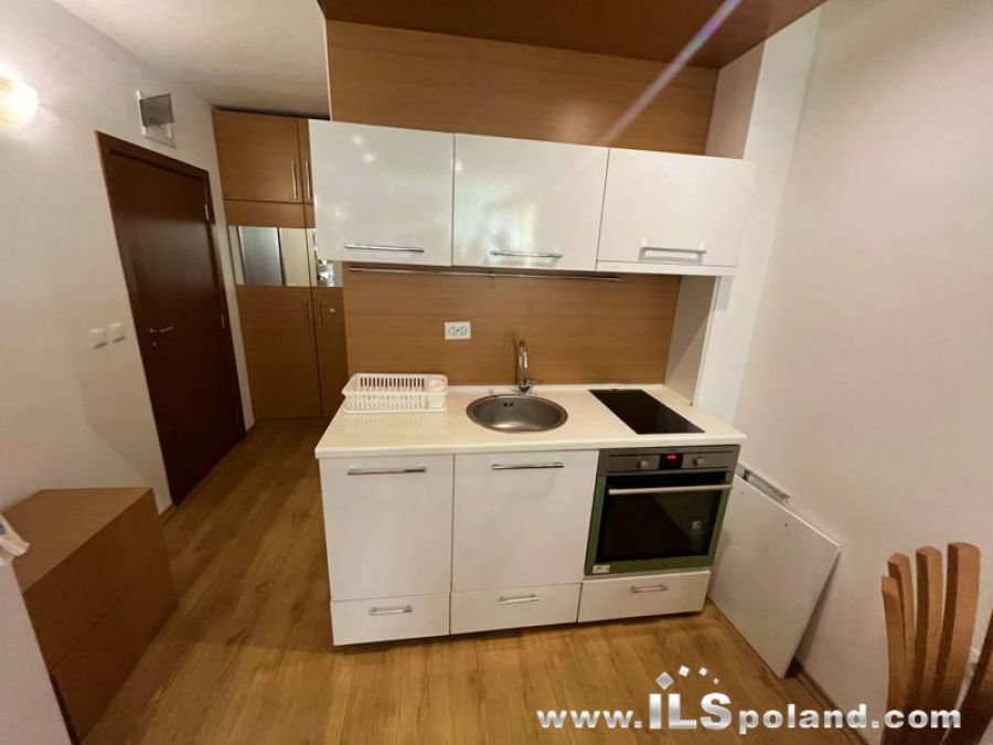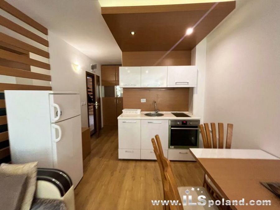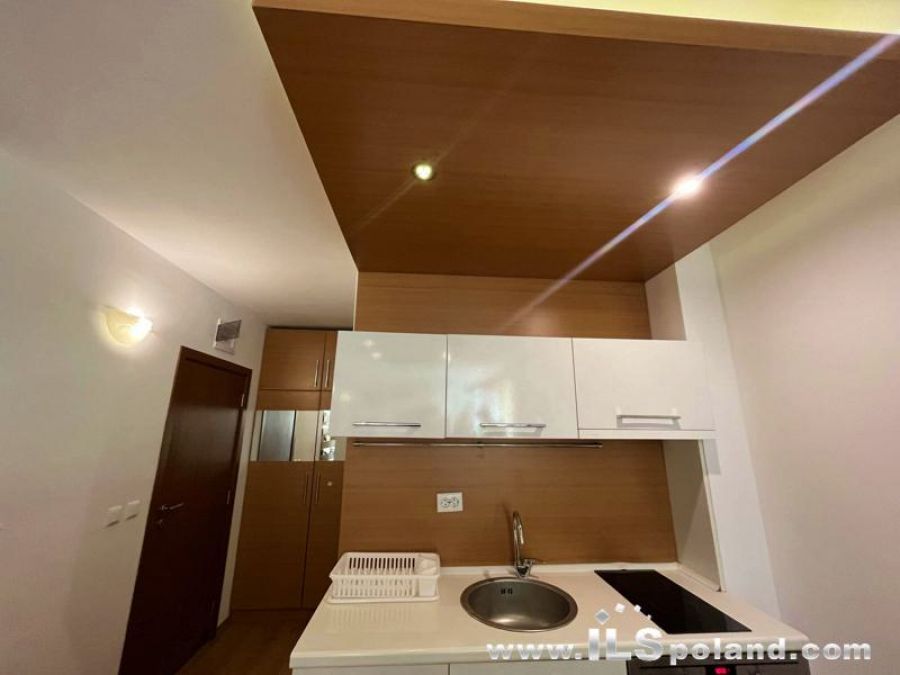 Apartament urządzony jest w wysokim standardzie i składa się z dużego salonu z aneksem kuchennym i wnęką sypialną, przedpokoju-korytarza z garderobą, łazienki z WC i balkonu z bezpośrednim widokiem na basen i ogród, należący do kompleksu (widok od strony południowo-wschodniej).