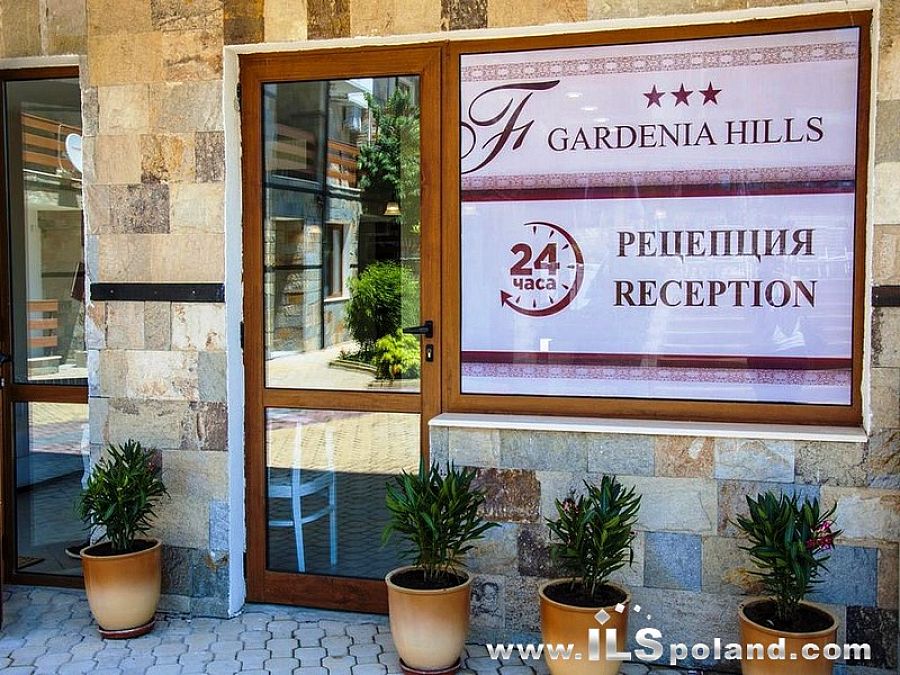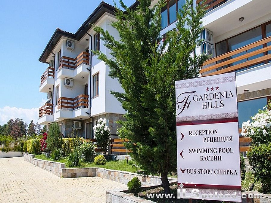 Gardenia Hills to całoroczny, trzygwiazdkowy kompleks apartamentowy, wybudowany w 2012 roku w klasycznym bułgarskim stylu z uwzględnieniem wielu nowoczesnych trendów architektonicznych, usytuowany na przedmieściach Słonecznego Brzegu w odległości około 1.200 m od plaży i morza, przy drodze prowadzącej do Kosharitsy w cichej i spokojnej okolicy z dala od zgiełku przyległego kurortu w malowniczej okolicy na wzgórzu z widokiem na morze.