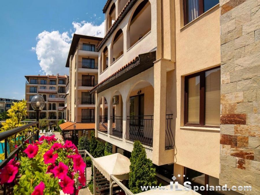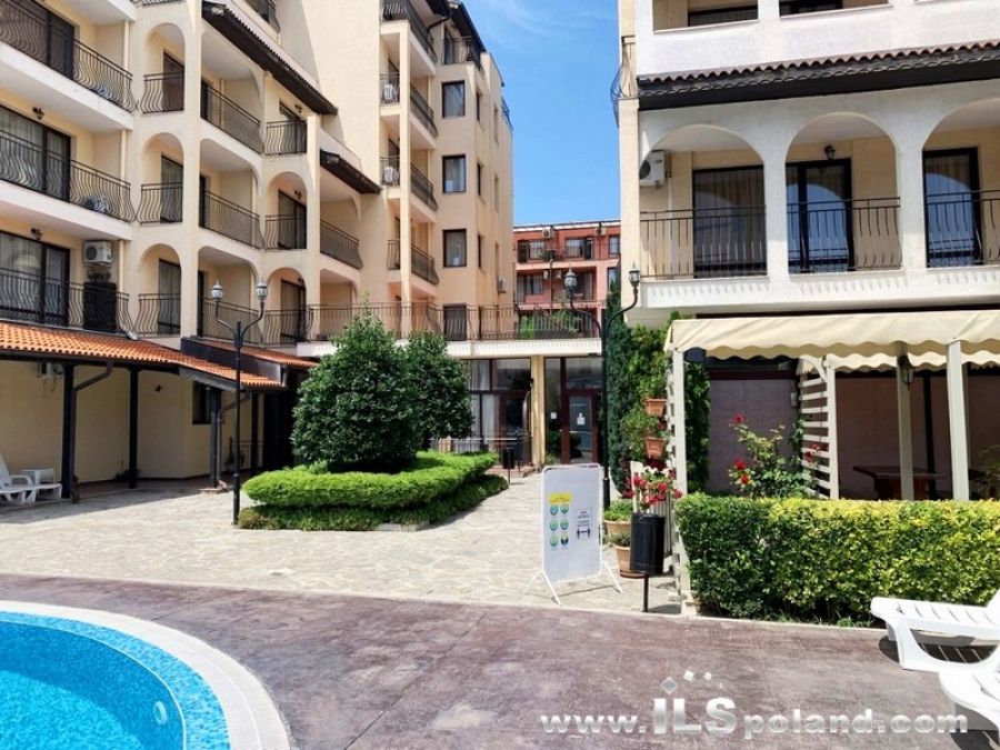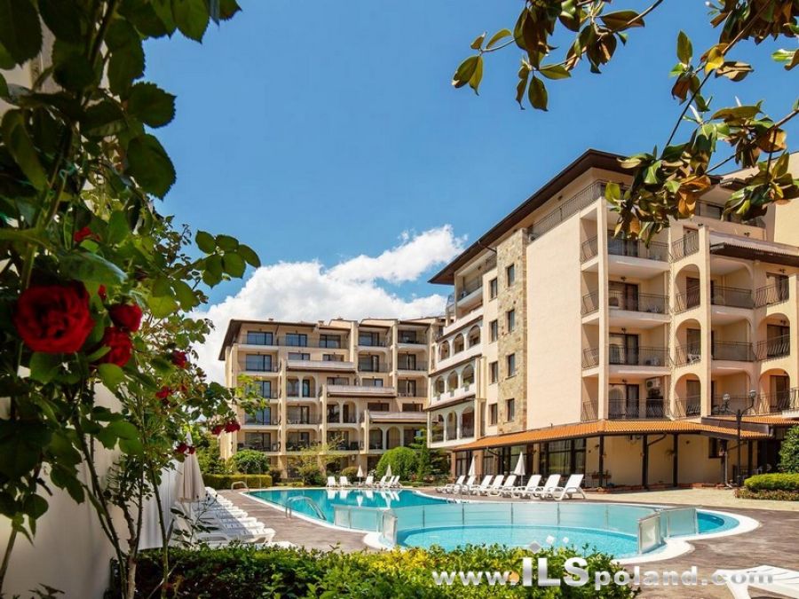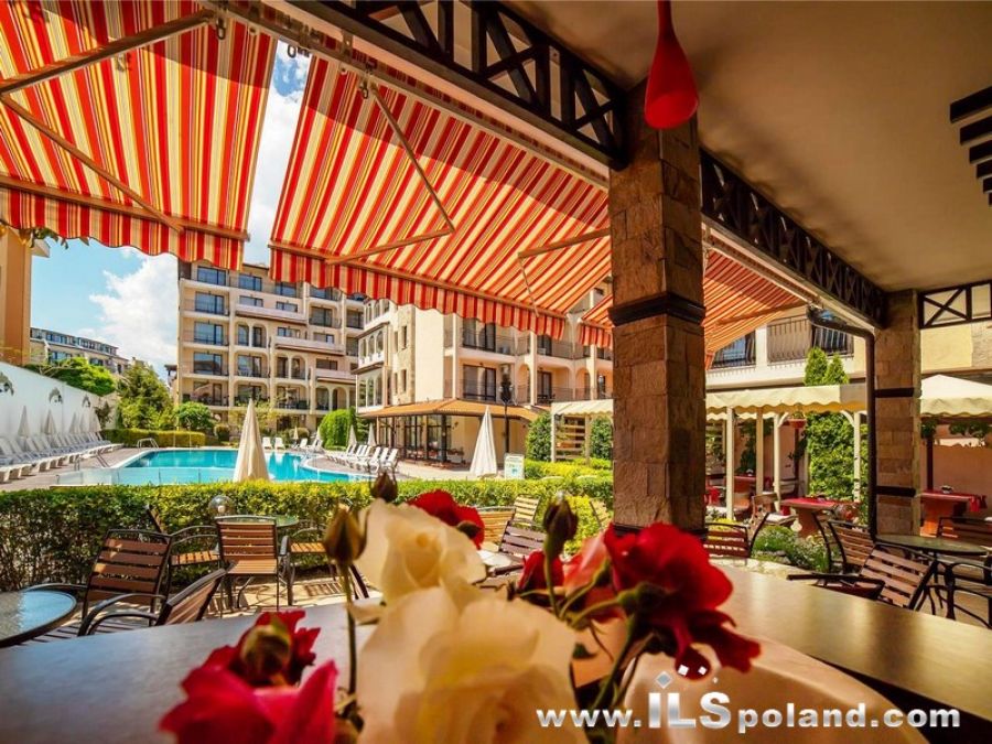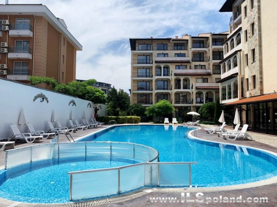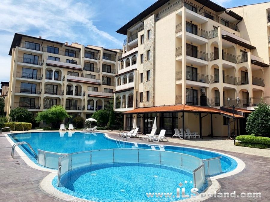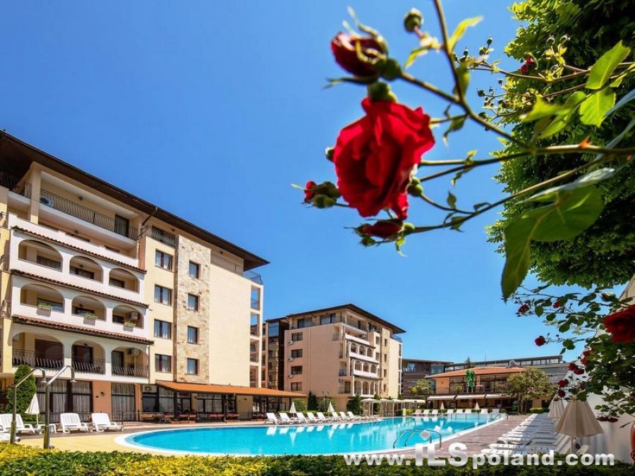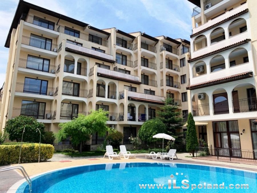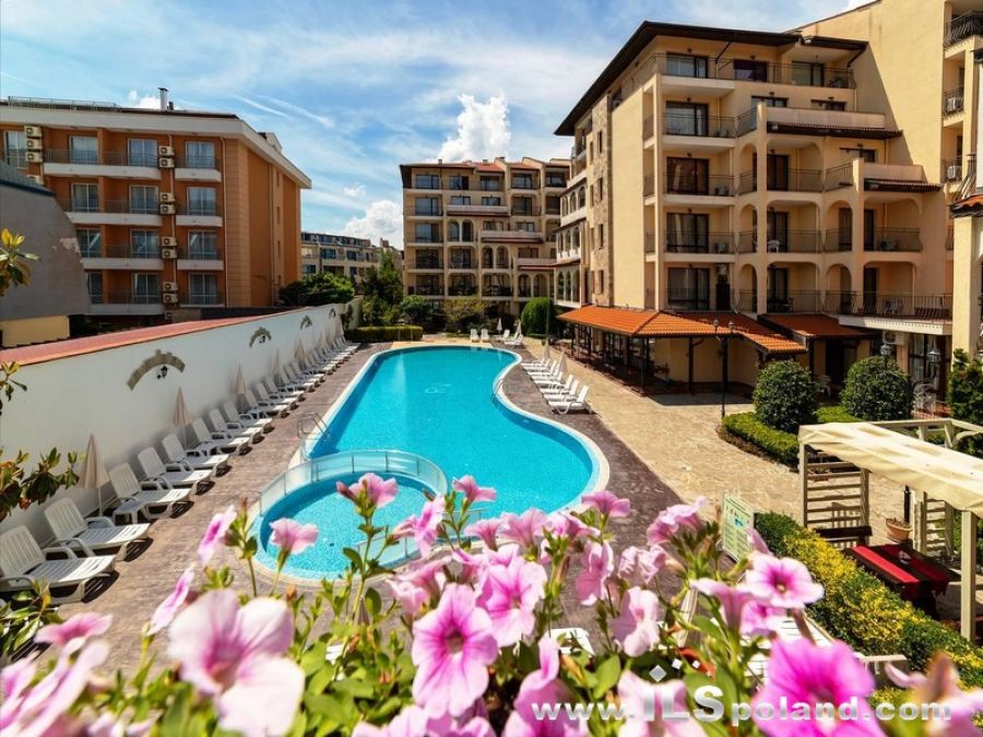 Przestronny apartament trzypokojowy z widokiem na basen oraz z umeblowaniem i wyposażeniem w eleganckim, całorocznym kompleksie apartamentowym Rose Village, w najbardziej znanym bułgarskim kurorcie Słoneczny Brzeg nad Morzem Czarnym w Bułgarii, w odległości zaledwie 300 m od najbardziej znanej plaży Cacao Beach.